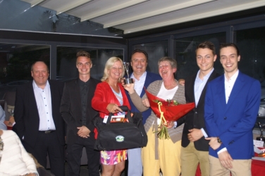Minke onze Ladies II Interclub captain kwam de trofee in ontvangst nemen. Het is met een bijzonder blij gezicht dat Guy haar alle eer aandeed, de ene zoen na de andere gevolgd door ho zo veel knuffels. De sfeer was onmiddellijk gezet en de familie kon blikken op alleen maar lachende toeschouwers. De Ferrari Trophy zal zoals bij Véronique Lechien waarschijnlijk op het salontafeltje ten toon worden gezet.