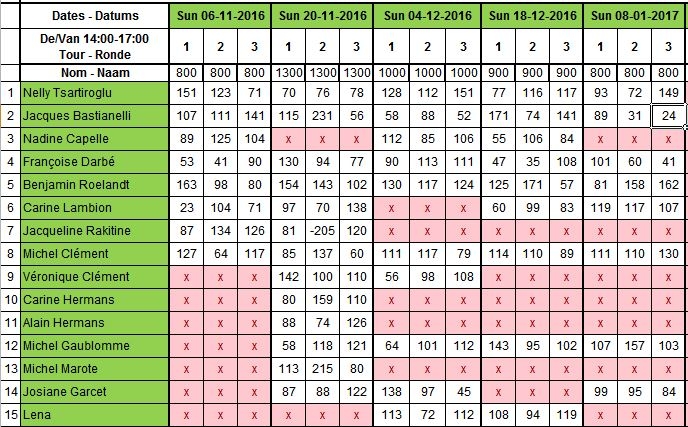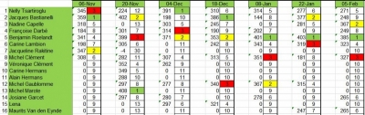 Benjamin est magistral, avec ses 385 points il règne sur l’après-midi et le classement général. Cette fois Nadine Capelle a mis le grand braquet, elle termine aujourd’hui avec 367 points. Michel Clément le 3e de la journée avec 327 point reste menaçant pour le troisième dans la liste. Il doit encore améliorer son score de 32 points pour dépasser Nelly pour autant que celle-ci reste sur sa position actuelle.